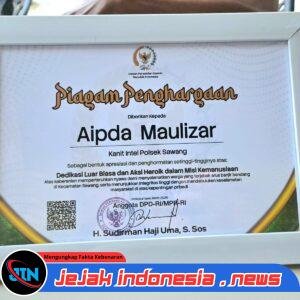 LhokseumaweJejakindonesia.news // Seorang personel Kepolisian Resor Lhokseumawe dari Polsek Sawang, Aipda Maulizar, menerima piagam penghargaan atas dedikasi luar biasa dan aksi heroik dalam misi kemanusiaan saat bencana banjir bandang melanda wilayah Kecamatan Sawang.