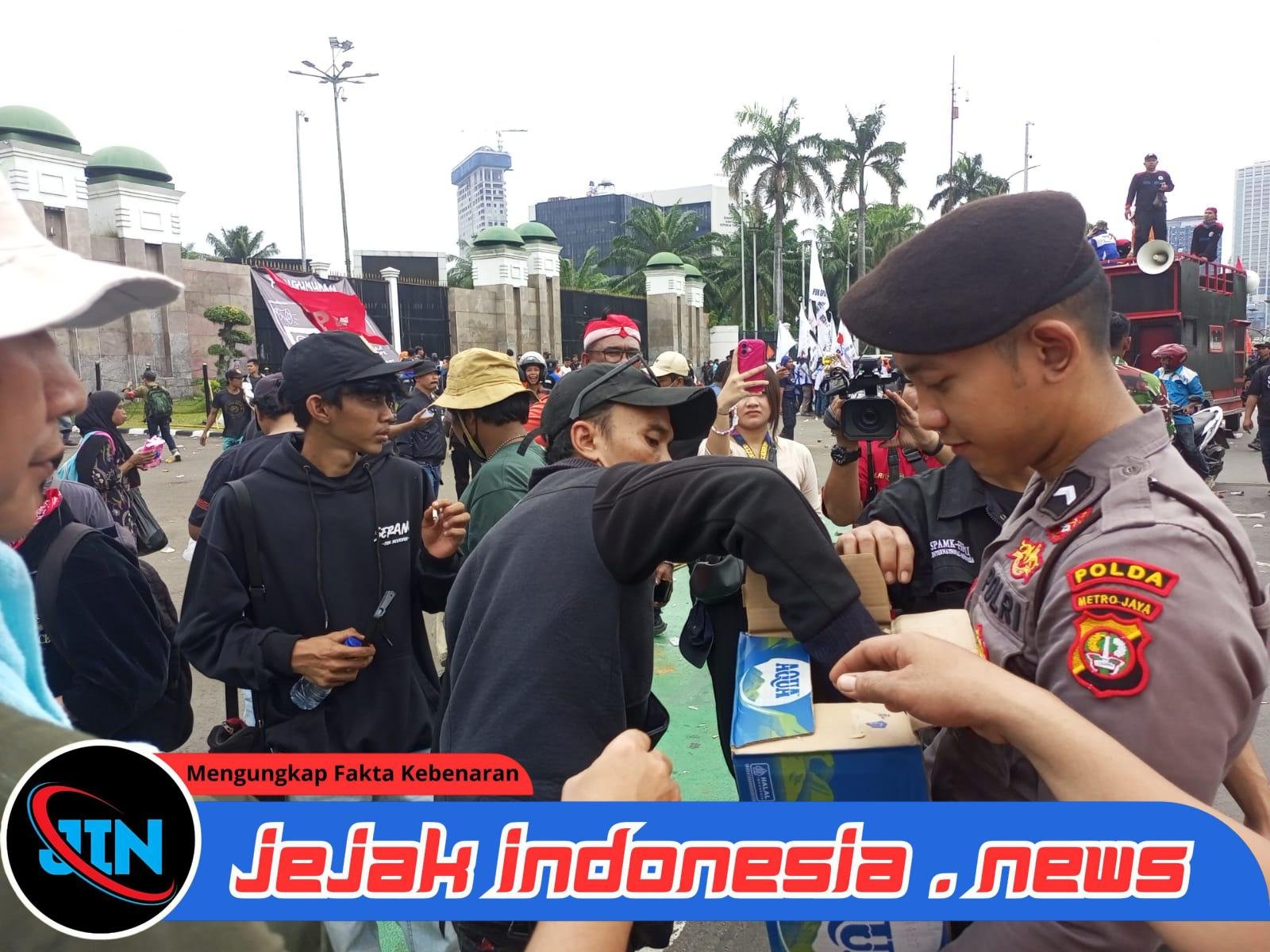 Jakarta – Jejakindonesia.news|Di sela-sela pengamanan aksi unjuk rasa elemen buruh di depan Gedung DPR/MPR RI, Kamis (28/8/2025), personel Samapta Polda Metro Jaya melakukan aksi simpatik dengan membagikan air mineral dan roti kepada para peserta aksi.