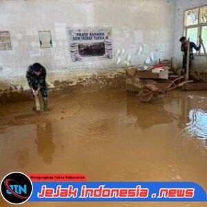 Mengembalikan ruang belajar yang layak, para prajurit bersama personel Kodaeral II bahu-membahu mengeruk tumpukan lumpur yang menutup akses pendidikan. Fokus utama mereka adalah memastikan ruang kelas, teras, hingga area halaman kembali bersih dan tertata.