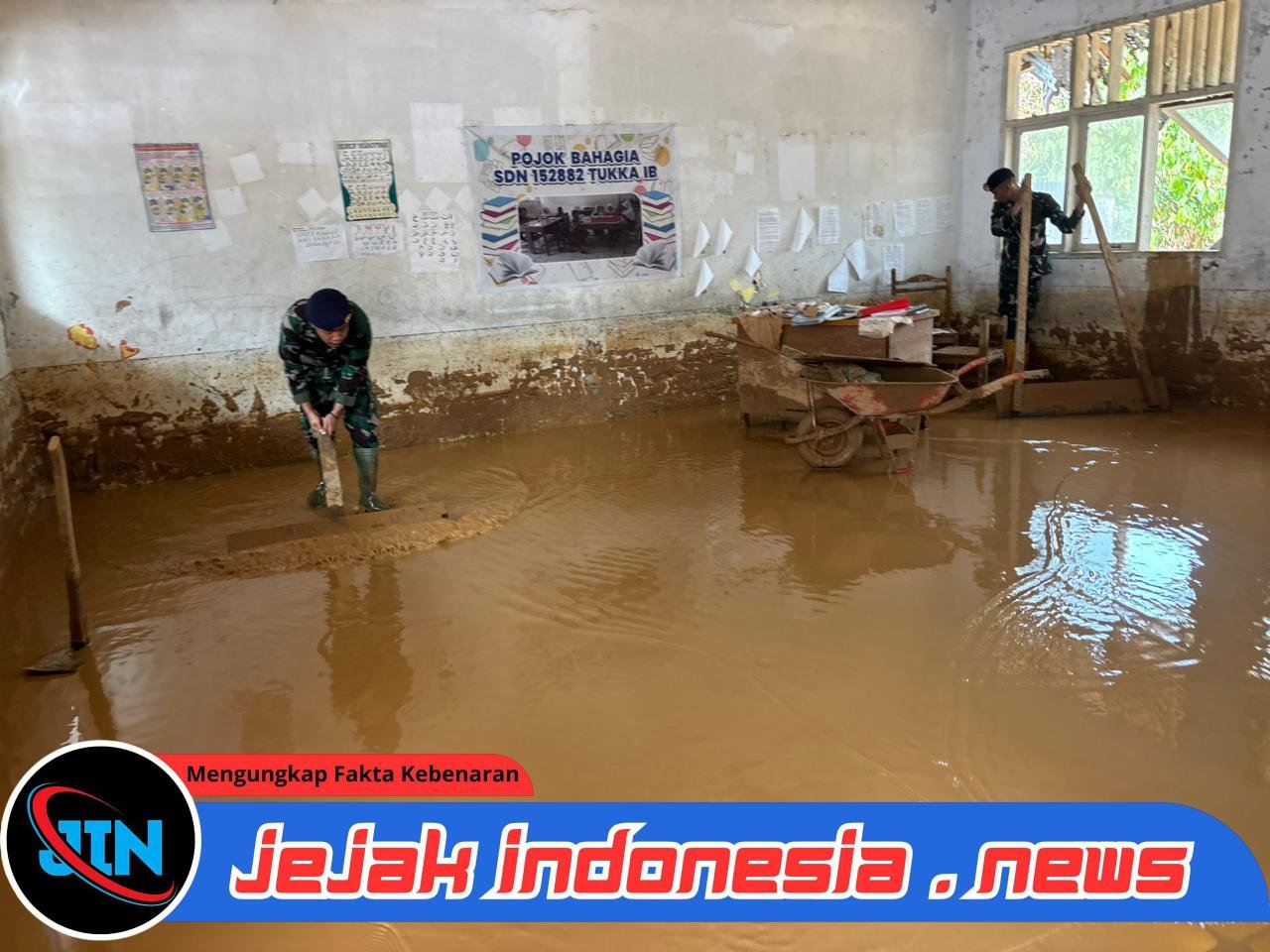 Pasca bencana yang melanda wilayah Kabupaten Tapanuli Tengah, sisa-sisa lumpur tebal masih mengendap di lantai kelas dan selasar sekolah. Kondisi ini menggerakkan para Prajurit Marinir TNI AL yang tergabung dalam Satgas Gulbencal Kodaeral II untuk turun melaksanakan perbantuan.