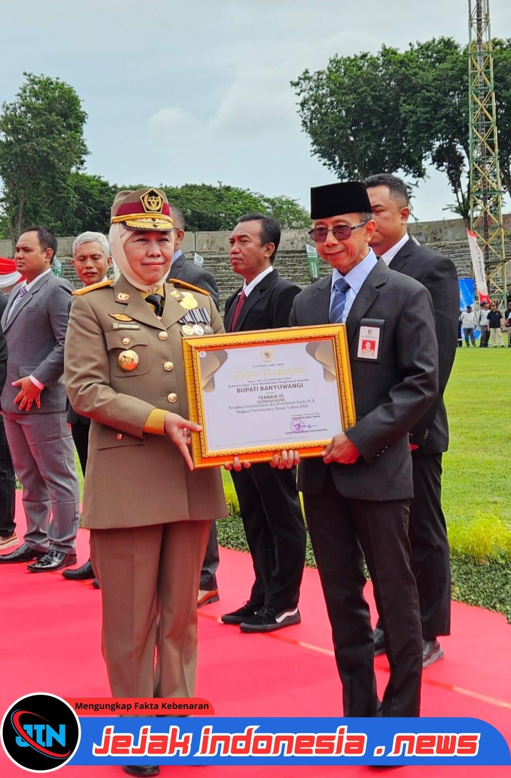 Penghargaan diserahkan oleh Gubernur Jawa Timur Khofifah Indar Parawansa dan diterima oleh Sekretaris Daerah (Sekda) Banyuwangi Guntur Priambodo, yang mewakili Bupati Ipuk, pada Upacara Peringatan Bulan Keselamatan dan Kesehatan Kerja (K3) Nasional Tahun 2026 di Stadion Utama Petrokimia Gresik GOR Tridharma, Kabupaten Gresik, Rabu (14/1/2026).