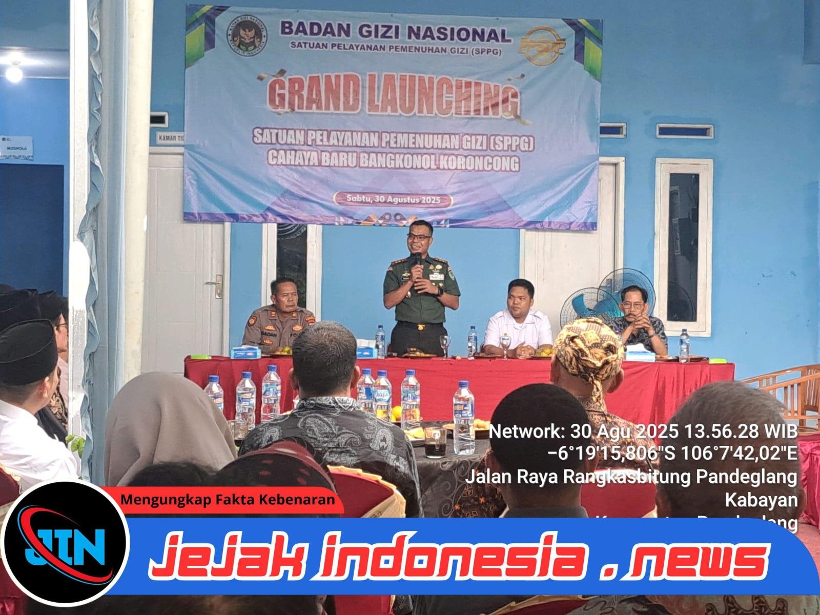 PANDEGLANG – Jejakindonesia.news| Bertempat di SPPG Cahaya Baru, Jl. Raya Rangkasbitung – Pandeglang, Kp. Sabi, Desa Bangkonol, Kecamatan Koroncong, Kabupaten Pandeglang, Dandim 0601/Pandeglang Letkol Inf Afri Swandi Ritonga, S.I.P., menghadiri kegiatan Grand Launching Satuan Pelayanan Pemenuhan Gizi (SPPG) yang digagas Badan Gizi Nasional (BGN). Acara ini dihadiri sekitar 70 peserta dengan penanggung jawab Ridwan, selaku Kepala SPPG, Sabtu (30/08/2025).