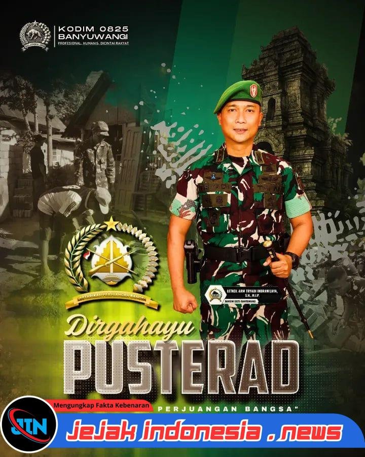 Banyuwangi — Jejakindonesia.news // Komandan Kodim (Dandim) 0825/Banyuwangi, Letkol Arm Tryadi Indrawijaya, S.H., M.I.P., bersama seluruh keluarga besar Kodim 0825/Banyuwangi menyampaikan ucapan selamat dan apresiasi atas peringatan Hari Ulang Tahun ke-37 Pusat Teritorial TNI Angkatan Darat (Pusterad TNI AD) yang jatuh pada tanggal 7 Maret 2026.