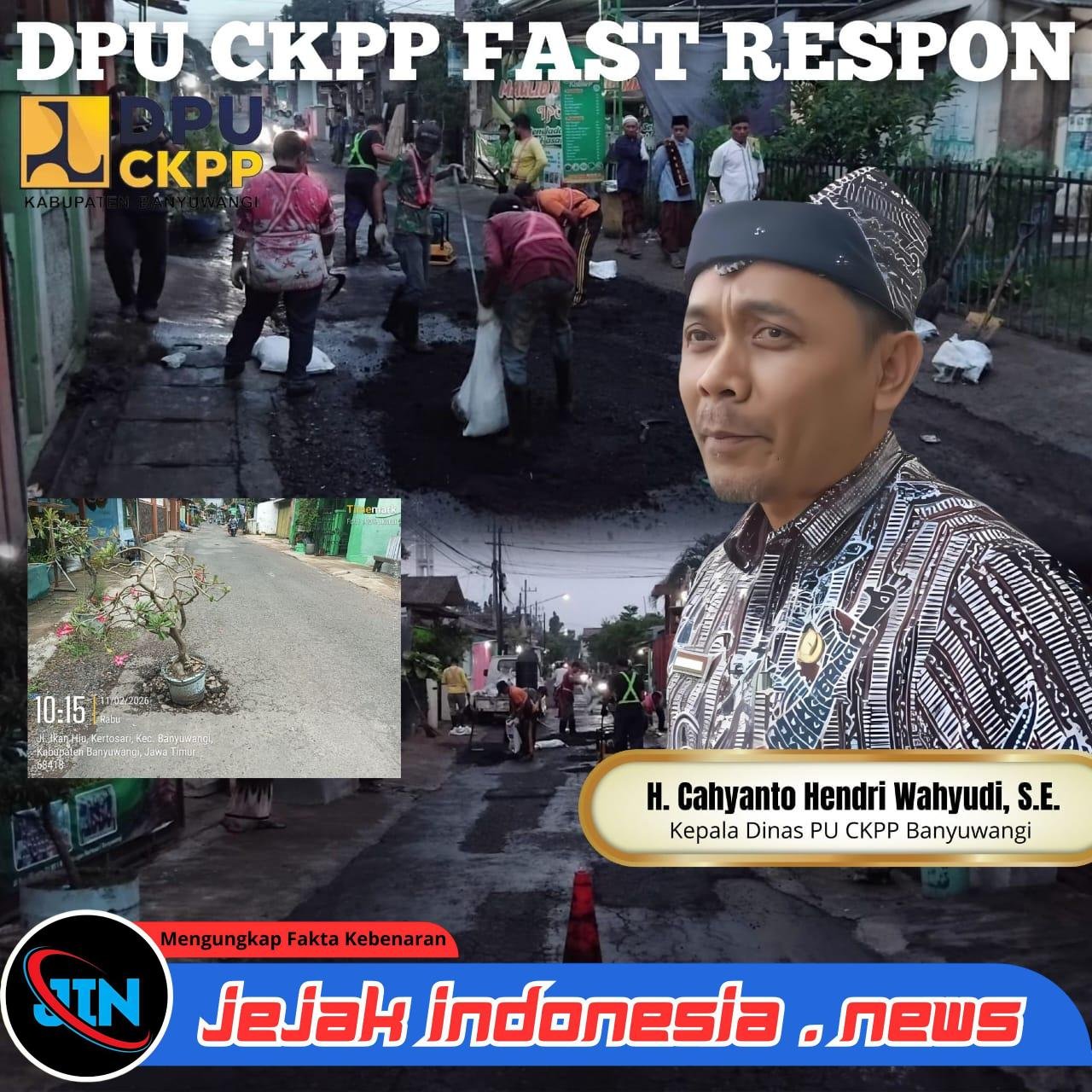 BanyuwangiJejakindonesia.news // Respons cepat ditunjukkan Dinas Pekerjaan Umum Cipta Karya, Perumahan dan Permukiman (PU CKPP) Kabupaten Banyuwangi dalam menindaklanjuti laporan masyarakat terkait kondisi jalan berlubang yang cukup parah di Jalan Ikan Hiu, Kelurahan Kertosari, Kecamatan Banyuwangi. Laporan tersebut mencuat pada Rabu (11/02/2026), setelah warga mengeluhkan banyaknya titik lubang yang dinilai membahayakan pengguna jalan.