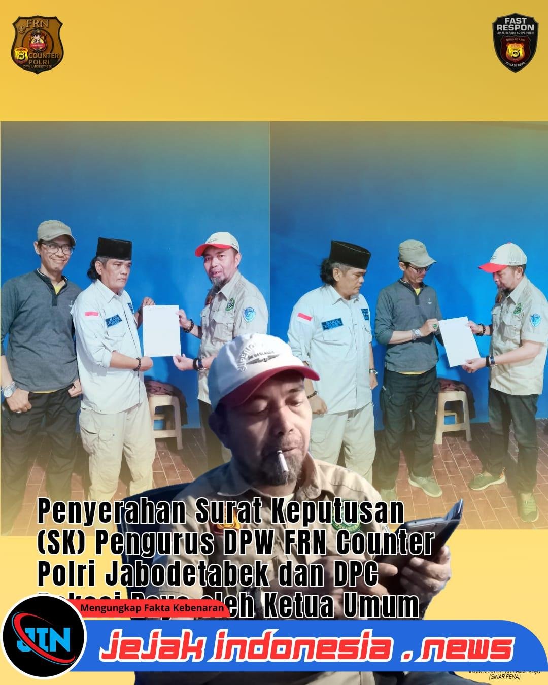 BEKASI – Jejakindonesia.news|Ketua Umum Perkumpulan Wartawan (PW) Fast Respon Nusantara (FRN) Counter Polri, Agus Flores, resmi menyerahkan Surat Keputusan (SK) kepengurusan kepada DPW FRN Counter Polri Jabodetabek dan DPC FRN Counter Polri Bekasi Raya dalam kunjungannya ke kantor baru FRN di Bekasi Raya, Jumat (1/8/2025).