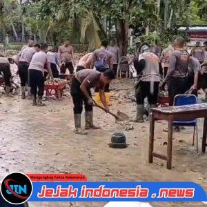 Sejak pukul 09.00 WIB, personel Sat Brimob Polda Aceh bahu-membahu membersihkan halaman dan ruang-ruang kelas dari lumpur serta sisa material banjir yang sebelumnya mengganggu aktivitas pendidikan. Pembersihan dilakukan secara menyeluruh agar seluruh fasilitas sekolah dapat digunakan secara optimal.