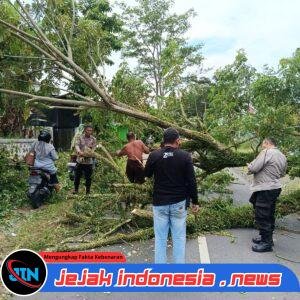 Banyuwangi – Jejakindonesia.news // Personel Polsek Songgon bergerak cepat mengevakuasi pohon tumbang jenis trembesi yang menutup akses jalan di depan KUD Songgon, Dusun Krajan, Desa Songgon, Kecamatan Songgon, Kabupaten Banyuwangi, Jumat (27/2/2026).