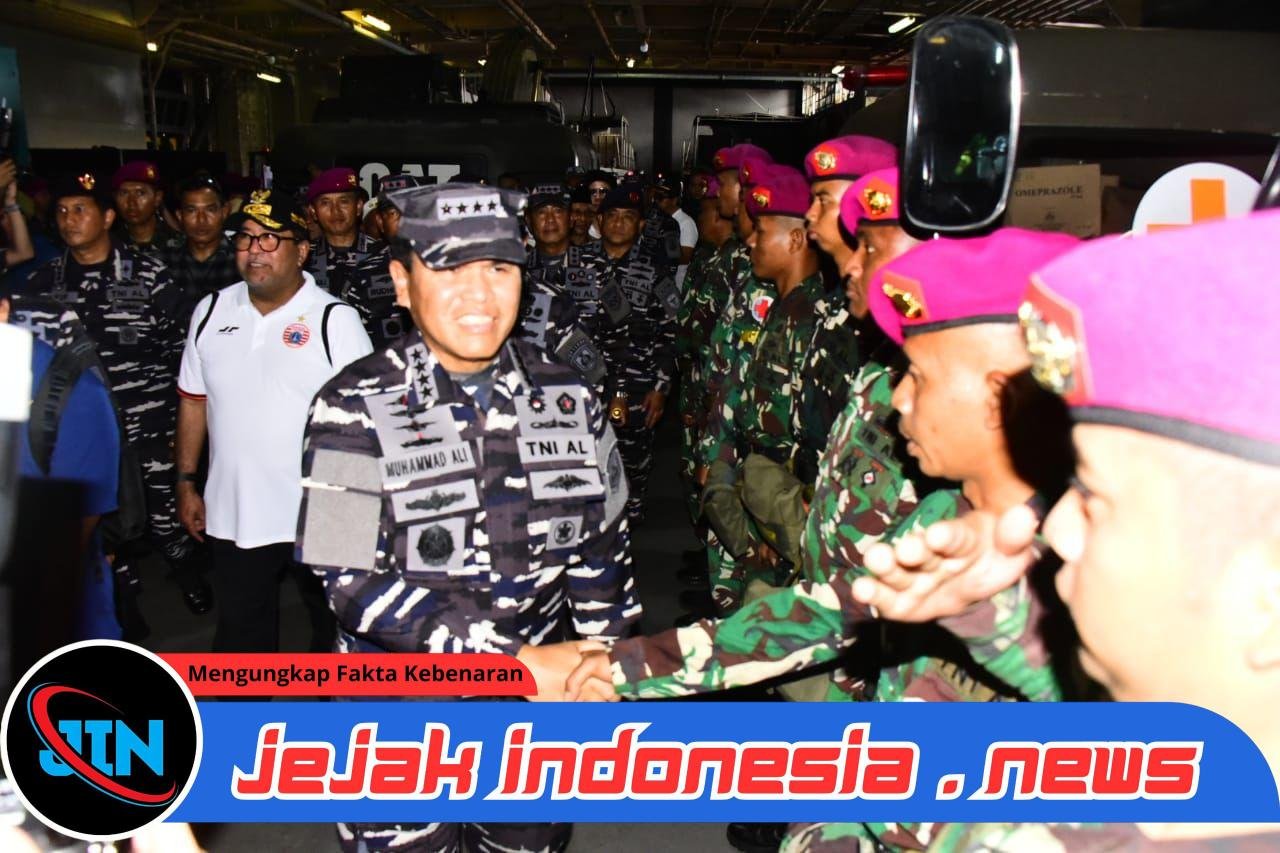 Di hadapan awak media, Kasal menyampaikan bahwa seluruh unsur KRI dikerahkan serentak beserta helikopter akan membawa bahan logistik dan bahan kontak ke tempat-tempat terputus dan terisolasi akibat bencana alam. “Harapannya, bantuan ini dapat segera meringankan beban mereka yang terdampak dari bencana. Kita juga mengirim tenaga kesehatan dan zeni marinir untuk membantu merehabilitasi apa yang telah rusak agar bisa diperbaiki di sana,” jelas Kasal.