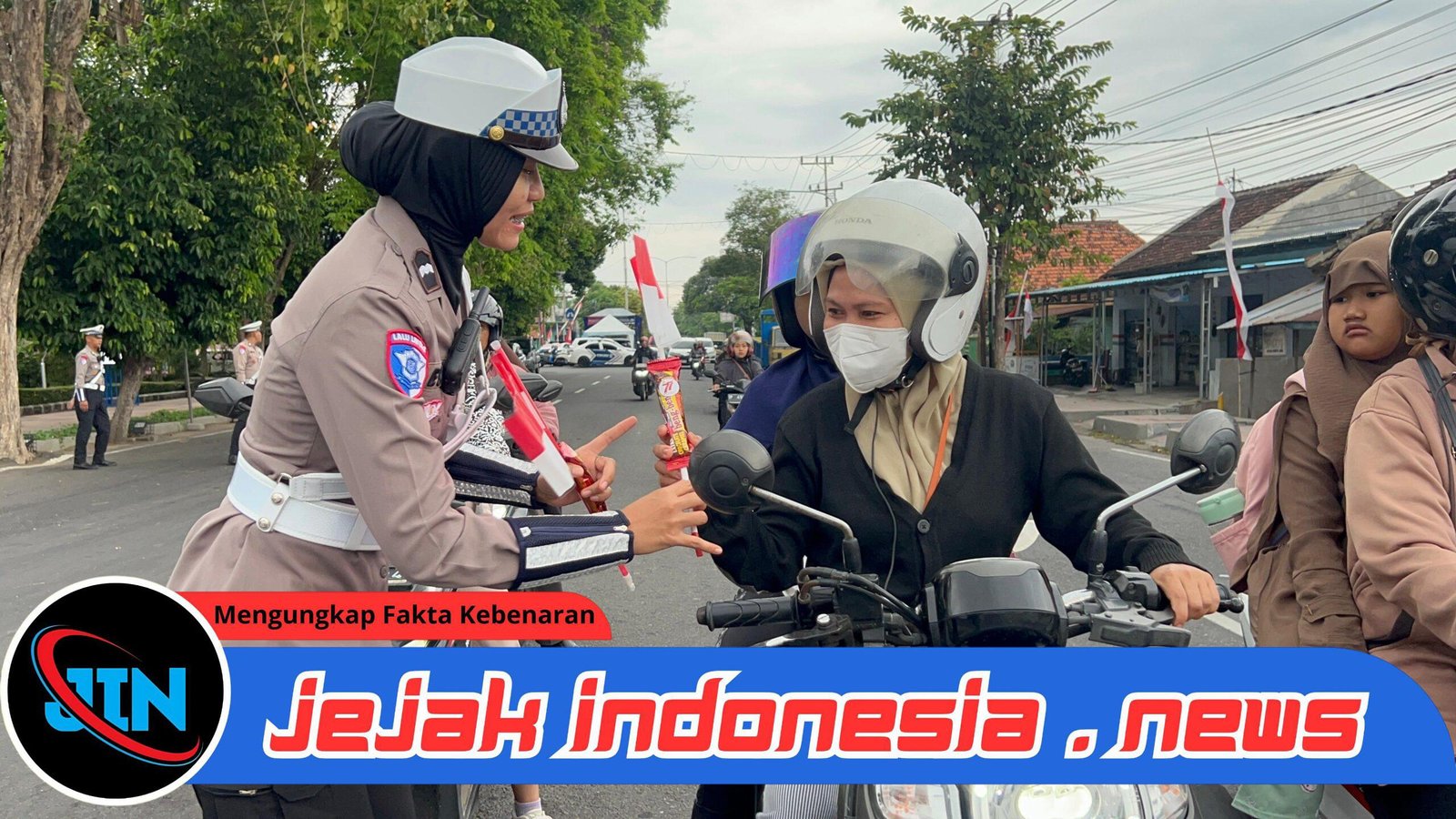 BANYUWANGI — Jejakindonesia.news|Dalam rangka memperingati Hari Jadi ke-77 Polisi Wanita (Polwan) Republik Indonesia, seluruh Polwan dari Polresta Banyuwangi menggelar kegiatan simpatik dengan membagikan coklat dan bendera kepada para pengguna jalan di Simpang Empat Patung Kuda, Banyuwangi, pada Selasa (26/8/2025).
