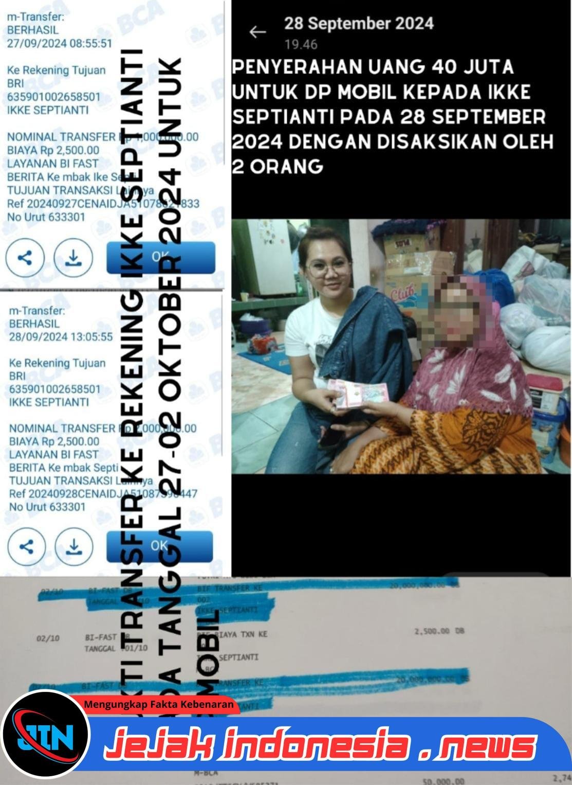 Penyerahan dilakukan secara tunai dan melalui transfer ke rekening bank atas nama Ikke Septianti. Penyerahan cash bahkan disaksikan dua orang di rumah kliennya di Surabaya pada September 2024.