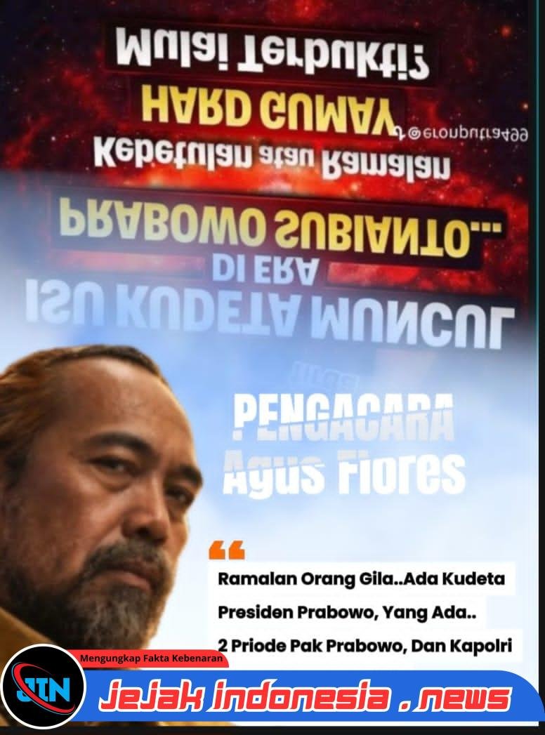 Jakarta – Jejakindonesia.news // Isu terkait adanya ramalan kudeta terhadap Presiden Prabowo Subianto menuai bantahan keras dari Ketua Umum Fast Respon Counter Polri, Agus Flores. Ia menilai narasi tersebut tidak berdasar dan cenderung mengarah pada provokasi yang berpotensi meresahkan masyarakat.