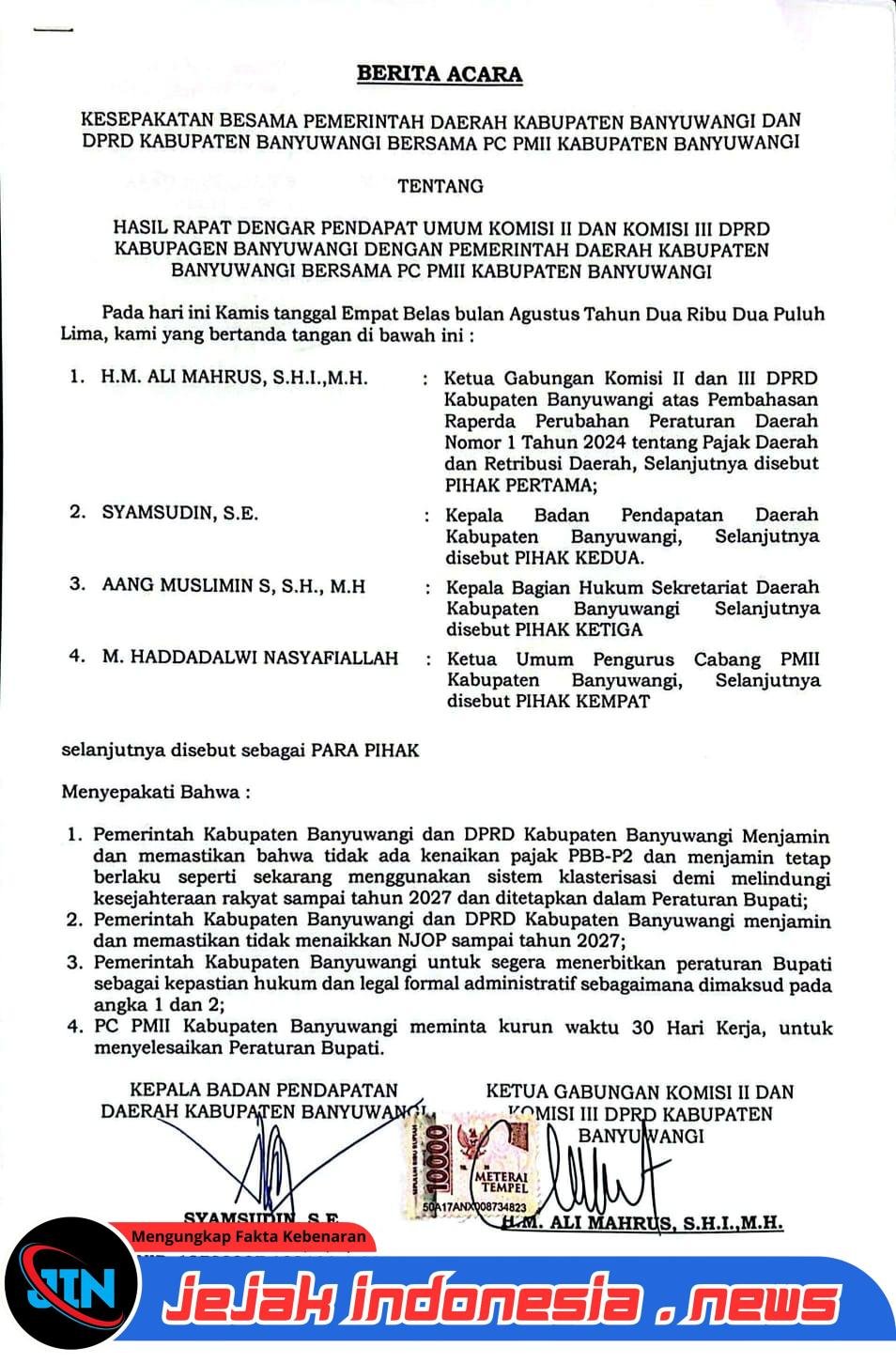 BANYUWANGI – Jejakindonesia.news| Pemerintah Kabupaten Banyuwangi bersama DPRD Kabupaten Banyuwangi sepakat tidak akan menaikkan Pajak Bumi dan Bangunan Perdesaan dan Perkotaan (PBB-P2) serta Nilai Jual Objek Pajak (NJOP) hingga tahun 2027. Kesepakatan itu ditegaskan dalam rapat dengar pendapat umum antara Komisi II dan III DPRD Banyuwangi dengan Pemkab Banyuwangi serta Pengurus Cabang Pergerakan Mahasiswa Islam Indonesia (PC PMII) Banyuwangi, Kamis (14/8/2025).