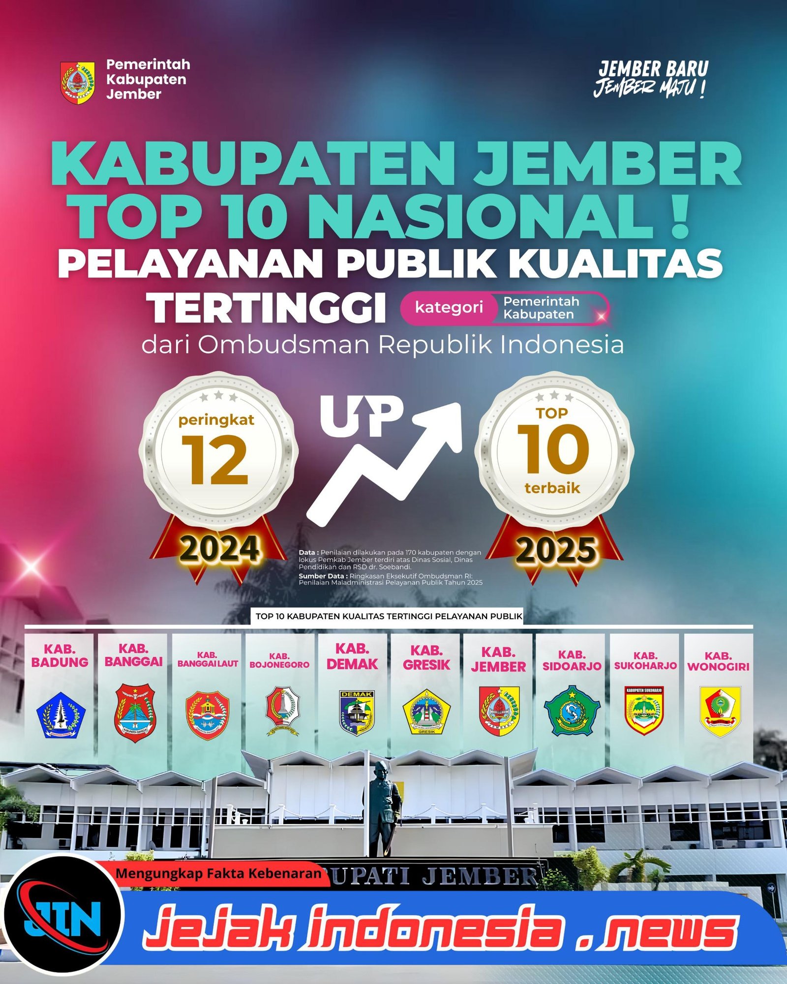 Jember – Jejakindonesia.news // Pemerintah Kabupaten Jember kembali menorehkan capaian membanggakan di tingkat nasional. Dalam kegiatan Penyampaian Opini Ombudsman Republik Indonesia atas Penilaian Maladministrasi Pelayanan Publik Tahun 2025 yang diselenggarakan secara virtual melalui Zoom Meeting pada Kamis (29/1/2026), Pemkab Jember dinyatakan berhasil masuk 10 besar nasional kategori Pemerintah Kabupaten dengan opini pelayanan publik “Kualitas Tertinggi”.