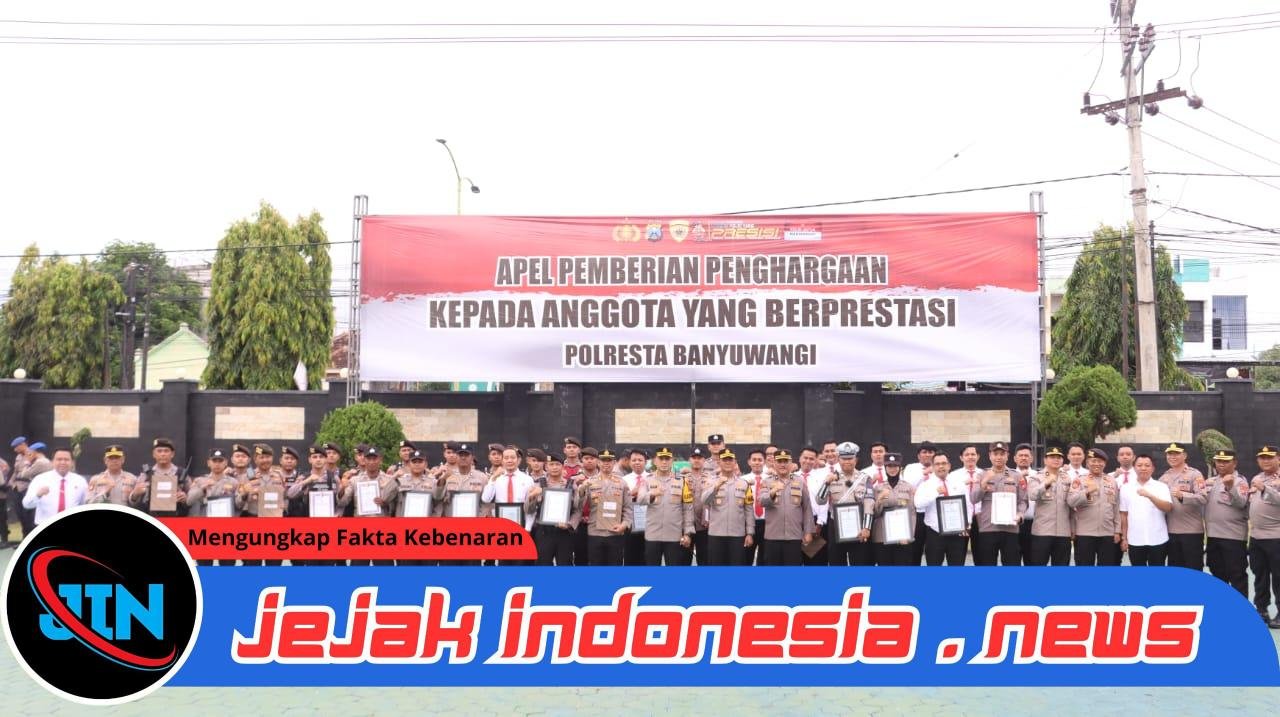 Banyuwangi – Jejakindonesia.news|Kepala Kepolisian Resor Kota (Kapolresta) Banyuwangi Kombes Pol Rama Samtama Putra, S.I.K., M.Si., M.H., memberikan penghargaan kepada 43 personel Polresta Banyuwangi dan Polsek jajaran yang berprestasi di berbagai bidang. Pemberian penghargaan berlangsung pada apel di Lapangan Apel Polresta Banyuwangi, Senin (8/9/2025).
