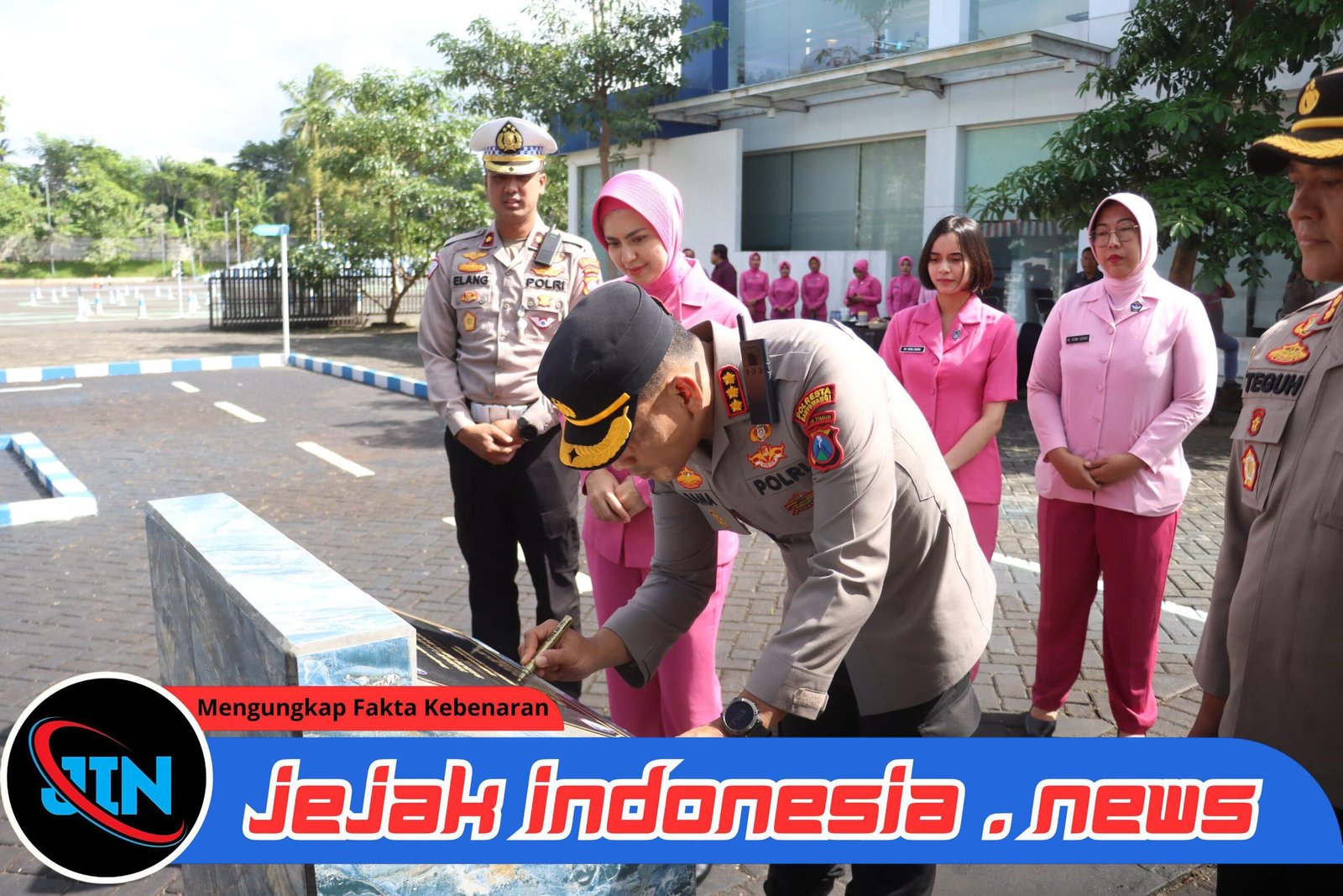 Banyuwangi — Jejakindonesia.news|Kapolresta Banyuwangi Kombes Pol Rama Samtama Putra, S.I.K., M.Si., M.H., bersama Wakapolresta AKBP Teguh Priyo Wasono,S.I.K., serta Pejabat Utama (PJU) Polresta Banyuwangi dan Bhayangkari meresmikan Taman Lalu Lintas Sarja Arya Racana di halaman Satpas Polresta Banyuwangi, Kamis (14/8/2025).