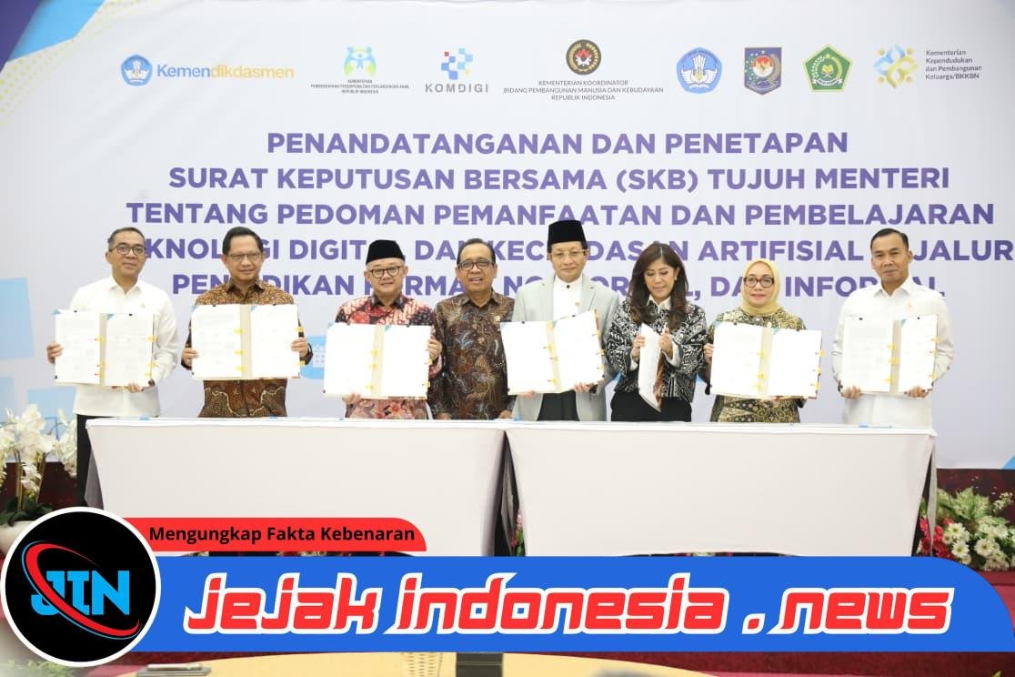 Jakarta – Jejakindonesia.news // Menteri Dalam Negeri (Mendagri) Muhammad Tito Karnavian menandatangani Surat Keputusan Bersama (SKB) 7 Menteri terkait pedoman pemanfaatan teknologi digital dan kecerdasan artifisial di jalur pendidikan formal, non-formal, dan informal. Prosesi penandatanganan itu berlangsung di Aula Heritage, Kantor Kementerian Koordinator (Kemenko) Bidang Pembangunan Manusia dan Kebudayaan (PMK), Jakarta, Kamis (12/3/2026).