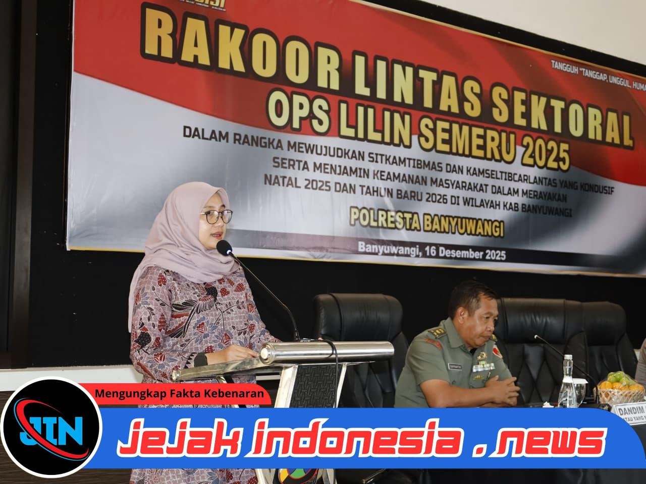 BANYUWANGIJejakindonesia.news // Pemerintah Kabupaten Banyuwangi bersama TNI, Polri, dan seluruh pemangku kepentingan menggelar Rapat Koordinasi (Rakor) Lintas Sektoral Operasi Lilin Semeru 2025 dalam rangka pengamanan Natal 2025 dan Tahun Baru 2026, Selasa (16/12/2025). Rakor yang berlangsung di Rupatama Polresta Banyuwangi, Jalan Brawijaya No.21, Kebalenan, ini diikuti sekitar 155 peserta lintas instansi dan dipimpin langsung Kapolresta Banyuwangi Kombes Pol Rama Samtama Putra, S.I.K., M.Si.
