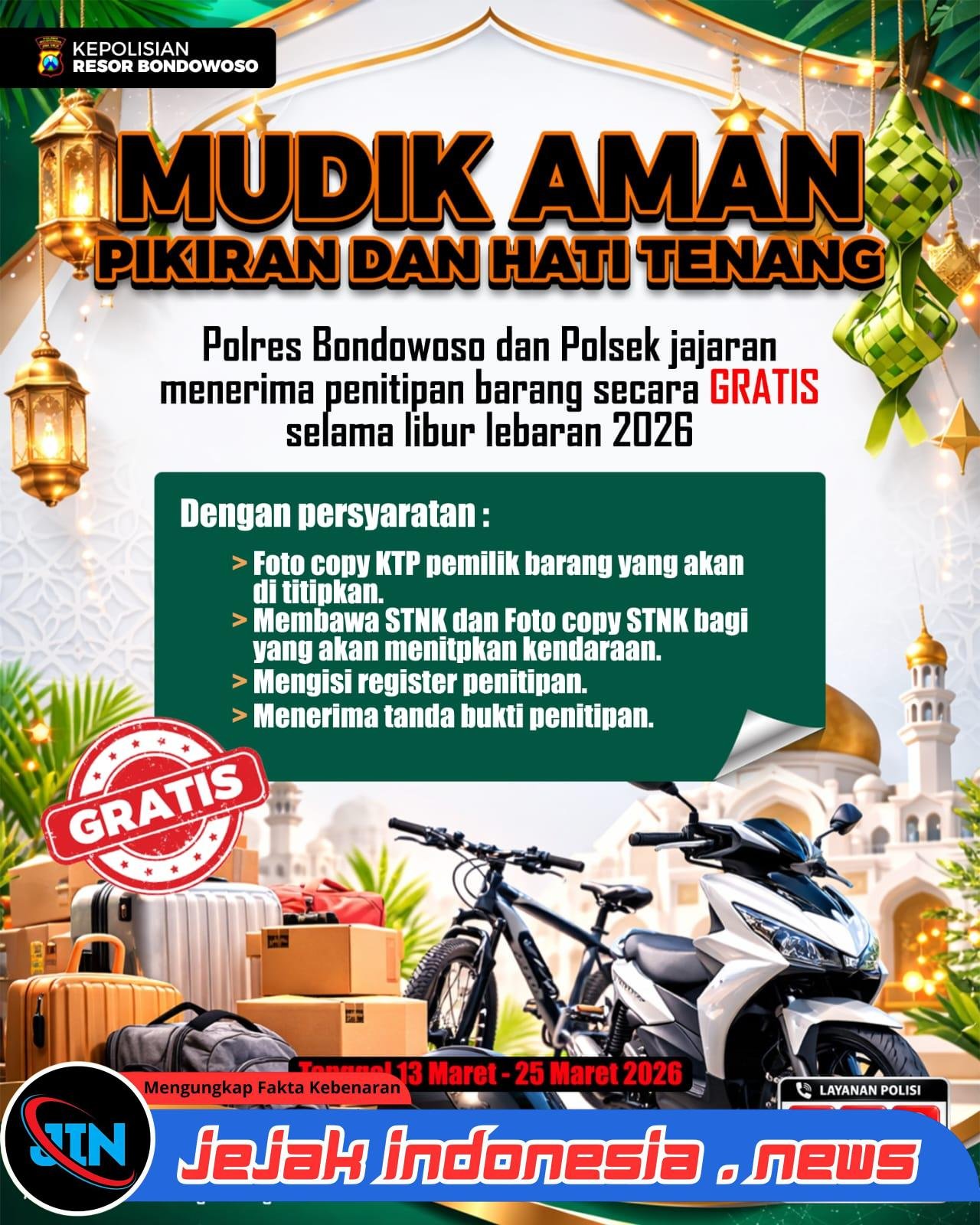 Memahami hal tersebut, Polres Bondowoso Polda Jatim meluncurkan inovasi layanan penitipan kendaraan dan barang berharga gratis bagi seluruh warga Kabupaten Bondowoso yang hendak pulang kampung.