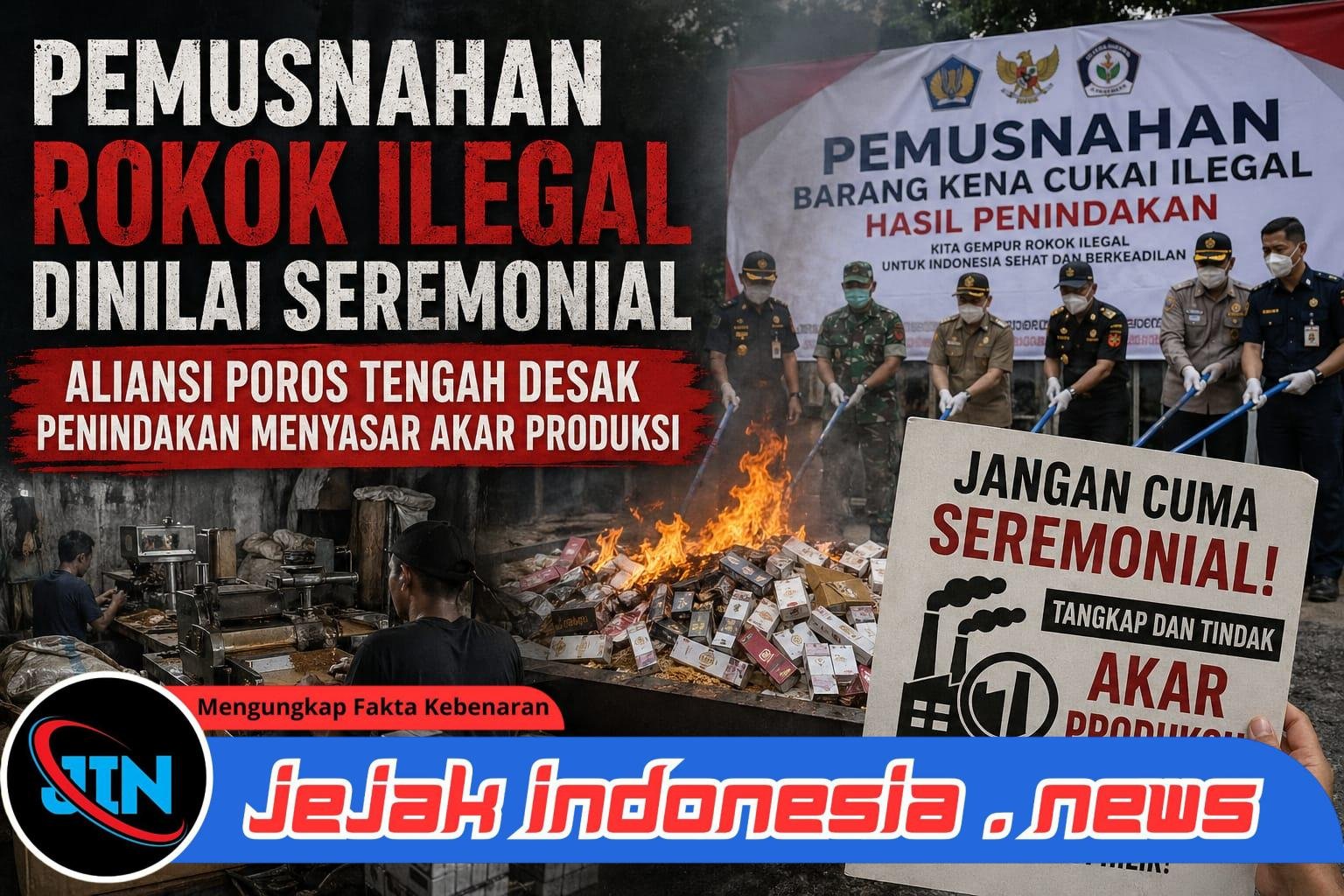 PASURUAN || Jejakindonesia.news — Kegiatan pemusnahan rokok ilegal tanpa pita cukai yang rutin digelar Bea Cukai Pasuruan kembali menuai kritik. Aliansi Poros Tengah menilai langkah tersebut lebih bersifat simbolik ketimbang solutif, karena tidak menyentuh sumber utama persoalan: keberlangsungan pabrik rokok ilegal yang diduga masih beroperasi. Senin 27/5/2026