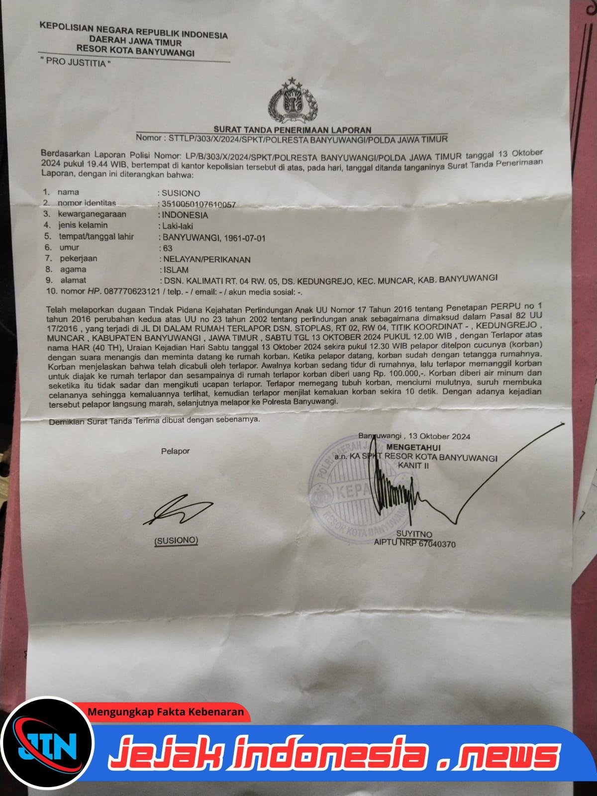 Laporan tersebut dibuat oleh Kakek korban, Susiono (63), pada 13 Oktober 2024 ke Polresta Banyuwangi dengan nomor STTLP/303/X/2024/SPKT/POLRESTA BANYUWANGI/POLDA JATIM. Dalam laporan itu, seorang pria berinisial H (40), warga setempat, diduga melakukan perbuatan yang melanggar Pasal 76E jo. Pasal 82 Undang-Undang Nomor 35 Tahun 2014 tentang Perlindungan Anak.