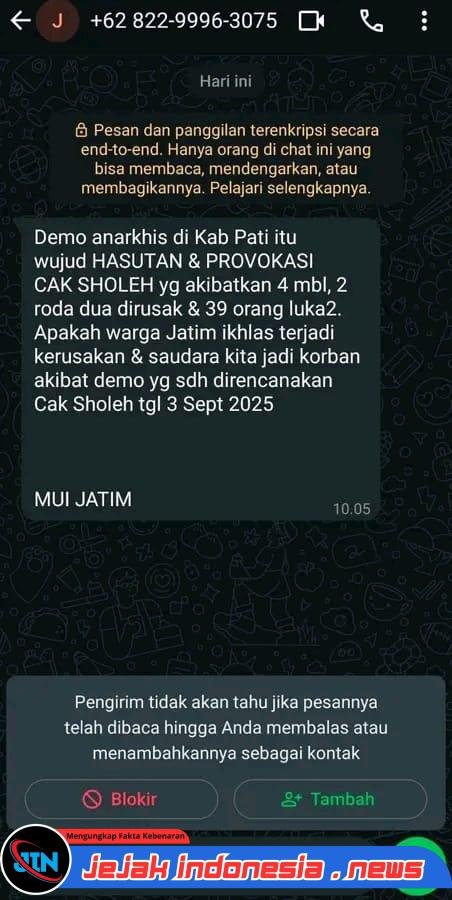 “Demo anarkhis di Kab Pati itu wujud HASUTAN & PROVOKASI CAK SHOLEH yg akibatkan 4 mbl, 2 roda dua dirusak & 39 orang luka2. Apakah warga Jatim ikhlas terjadi kerusakan & saudara kita jadi korban akibat demo yg sdh direncanakan Cak Sholeh tgl 3 Sept 2025 — MUI JATIM”