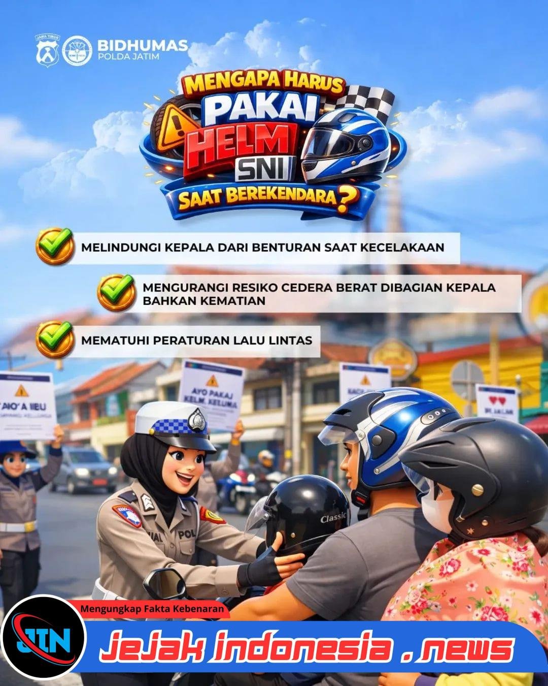 Surabaya – Jejakindonesia.news // Kepolisian Daerah Jawa Timur (Polda Jatim) melalui Direktorat Lalu Lintas (Ditlantas) Polda Jatim terus menggencarkan kampanye keselamatan berlalu lintas kepada masyarakat. Salah satu fokus utama dalam kampanye tersebut adalah ajakan untuk menggunakan helm berstandar Nasional Indonesia (SNI) saat berkendara sepeda motor, sebagai bentuk perlindungan utama bagi keselamatan pengendara, bukan sekadar pemenuhan aturan semata.