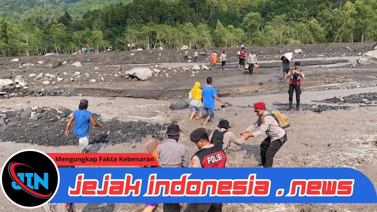 LUMAJANG – Jejakindonesia.news // Sejumlah personel Polres Lumajang, Polda Jawa Timur (Jatim) diterjunkan untuk membantu warga masyarakat yang menyeberangi aliran banjir lahar Gunung Semeru di Sungai Regoyo, Sabtu sore (6/12).