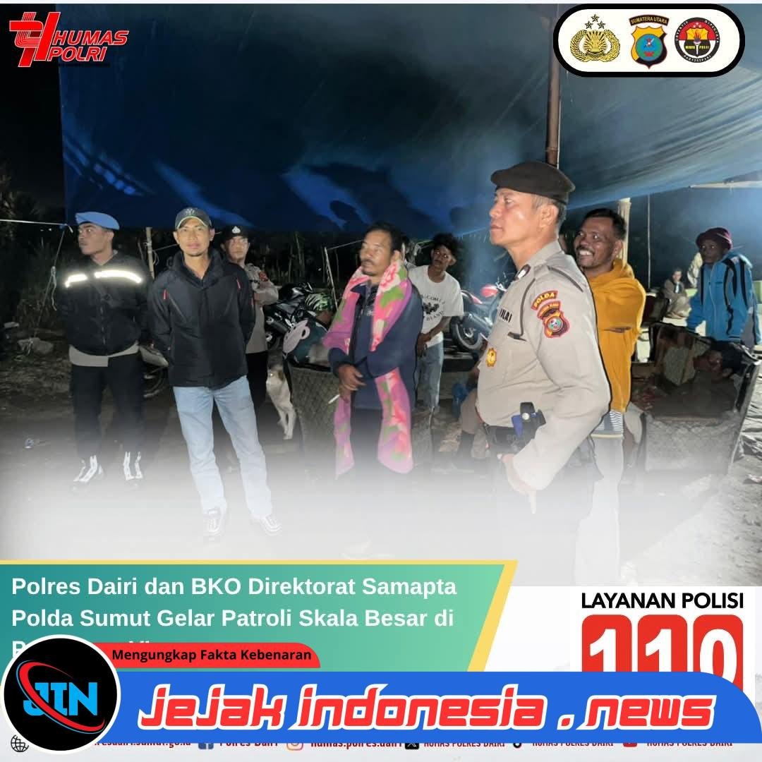 DAIRI – Jejakindonesia.news|Personel Polres Dairi bersama Personel BKO Direktorat Samapta Polda Sumatera Utara melaksanakan kegiatan pengamanan dan patroli skala besar di Desa Parbuluan VI, Kecamatan Parbuluan, Kabupaten Dairi, pada Jumat malam (14/11/2025).