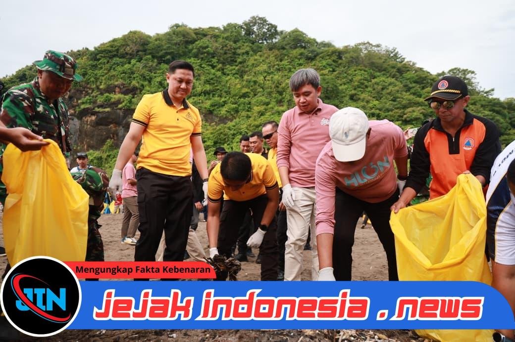 Sejumlah Pejabat Utama Polres Jember, Muspika Kabupaten Jember yang terdiri dari unsur TNI, pemerintah kecamatan, desa, serta elemen masyarakat menyisir dan membersihkan sampah di pesisir pantai.