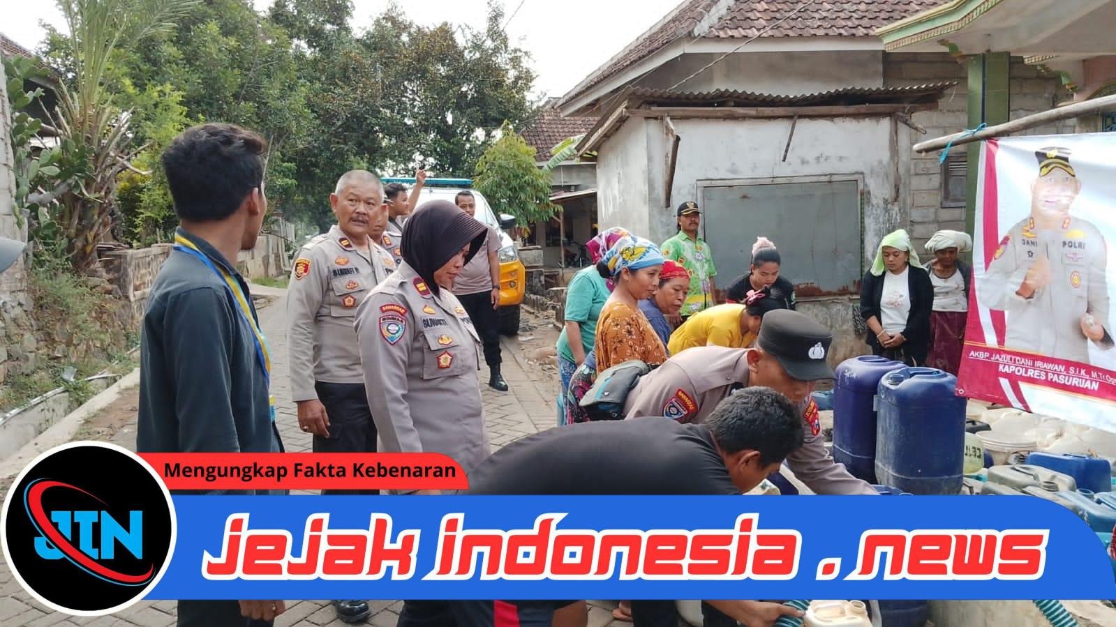Pasuruan – Jejakindonesia.news | Polres Pasuruan Polda Jawa Timur bersama organisasi mahasiswa PC Pergerakan Mahasiswa Islam Indonesia (PMII) Pasuruan menyalurkan bantuan air bersih sebanyak 6.000 liter untuk warga Desa Karangjati, Kecamatan Lumbang, Kabupaten Pasuruan yang terdampak kekeringan.
