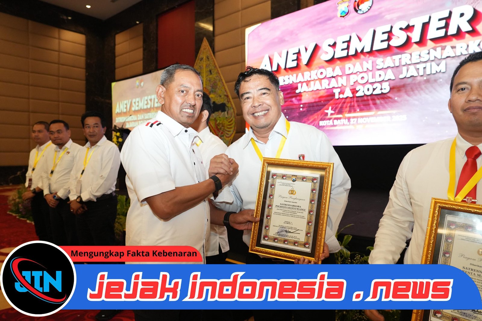 Banyuwangi – Jejakindonesia.news // Prestasi membanggakan kembali ditorehkan Polresta Banyuwangi. Pada kegiatan Rakernis dan Anev Ditresnarkoba Polda Jatim Tahun 2025, Kasat Resnarkoba Polresta Banyuwangi berhasil meraih penghargaan Juara II Kelompok A, sebagai apresiasi atas kinerja unggul dalam pengungkapan kasus narkoba selama periode Januari hingga November 2025. Jumat (28/11/2025)