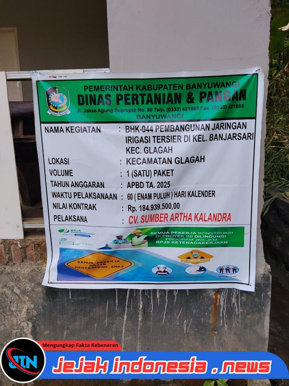 Banyuwangi – Jejakindonesia.news | Proyek pembangunan Jaringan Irigasi Tersier “asal jadi” dari Dinas Pertanian dan Pangan Kabupaten Banyuwangi di Kelurahan Banjarsari yang dikerjakan oleh CV Sumber Artha Kalandra diduga tidak sesuai Standar Operasional Prosedur (SOP)