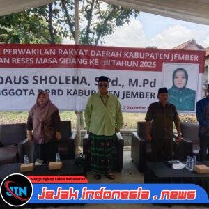 JEMBER – Jejakindonesia.news // Kegiatan reses Masa Sidang ke-lll Tahun 2025 yang digelar di Dusun Krebet, Desa Gumukmas,Kecamatan Gumukmas,Kabupaten Jember, Provinsi Jawa Timur, Rabu 3 Desember 2025, Komitmen wakil rakyat dalam menyerap serta memperjuangkan aspirasi masyarakat kembali ditunjukkan oleh anggota DPRD Kabupaten Jember dari Komisi A Fraksi Partai Persatuan Pembangunan, Siti Baidaus Sholeha, S.Pd., M.Pd.