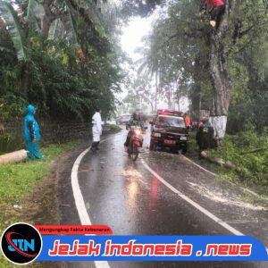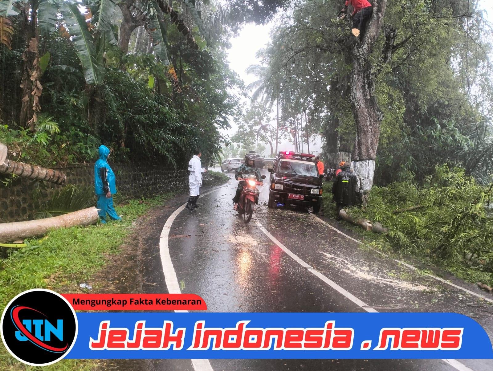 BANYUWANGIJejakindonesia.news // Hujan deras yang mengguyur wilayah Kecamatan Glagah pada Kamis (12/2/2026) siang mengakibatkan sebuah pohon jenis Sengon dengan diameter sekitar 50 cm tumbang di area Tikungan Cawan, Dusun Salakan, Desa Kenjo. Pohon tersebut roboh melintang di tengah jalan, sehingga sempat memutus arus lalu lintas yang menghubungkan wilayah Kecamatan Glagah dengan Kecamatan Licin.