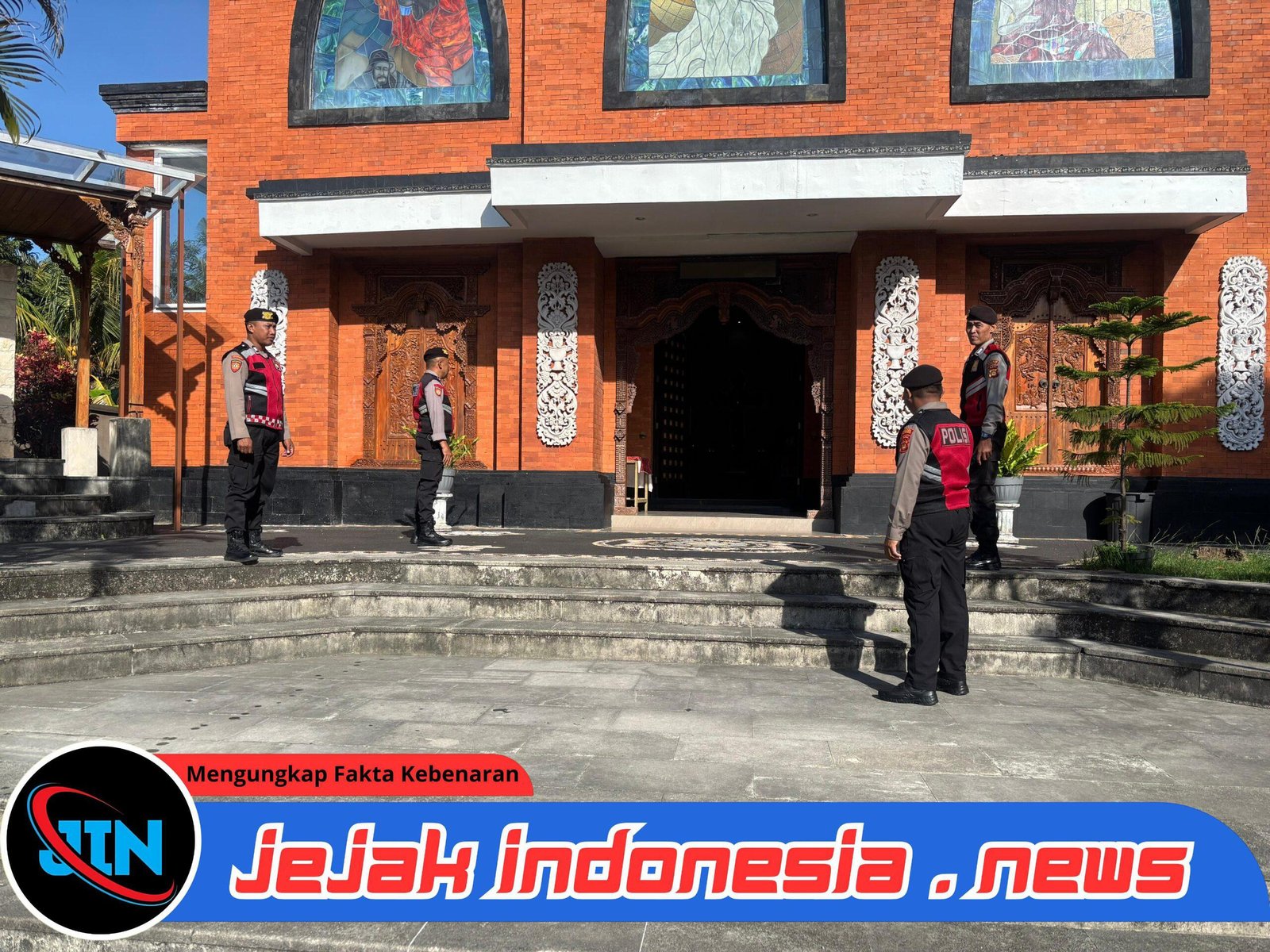 Polres Klungkung – Jejakindonesia.news // Personel Satuan Samapta Polres Klungkung melaksanakan pengamanan kegiatan peribadatan di Gereja Santa Sisilia, Kabupaten Klungkung, (19/4).