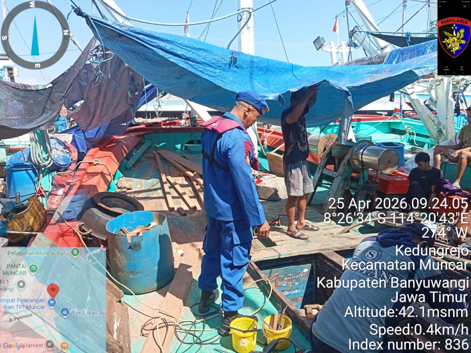 Aipda I Wayan Wedhana (Kanit Satpolairud Unit Muncar) Di atas geladak kapal yang sedang dalam proses perbaikan palka, Bripka I Wayan Wedhana tidak hanya hadir sebagai aparat, tetapi juga sebagai sahabat nelayan. Ia berdialog langsung, mendengar, sekaligus memberikan edukasi yang menyentuh kebutuhan nyata di lapangan.
