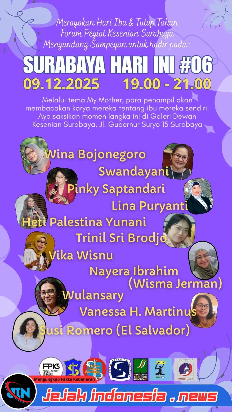 Surabaya – Jejakindonesia.news // Sebelas perempuan hebat dari berbagai disiplin akan merayakan Hari Ibu sekaligus menutup tahun pada acara Surabaya Hari Ini #06 yang digelar Forum Pegiat Kesenian Surabaya (FPKS) pada 09 Desember 2025, di Galeri Dewan Kesenian Surabaya, Kompleks Balai Pemuda, Jl. Gubernur Suryo No 15 Surabaya.