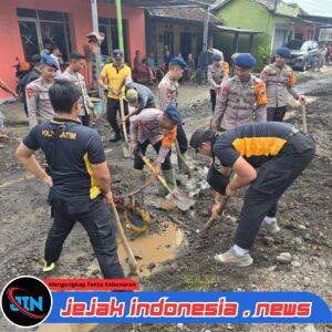 Personel gabungan melaksanakan kerja bakti membersihkan rumah warga dan jalan yang tertutup lumpur, sekaligus membagikan makanan kepada masyarakat.