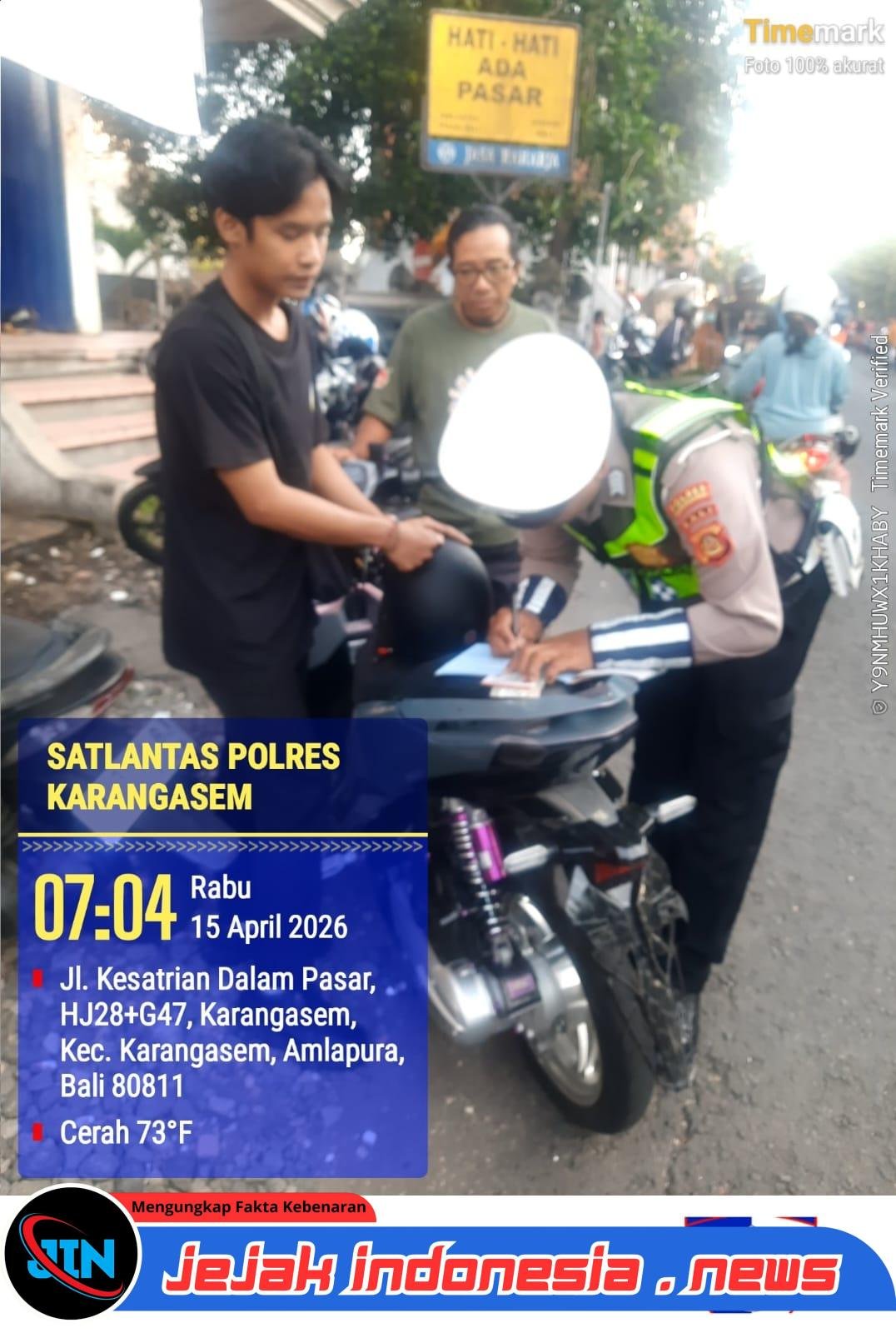 Sat Lantas Polres Karangasem kembali mengintensifkan penerapan tilang manual bagi pengendara yang melakukan pelanggaran kasatmata di wilayah hukum Kabupaten Karangasem pada hari Rabu, 15 April 2026 Langkah ini diambil sebagai pelengkap sistem tilang elektronik (ETLE) guna menekan angka kecelakaan dan meningkatkan kesadaran berlalu lintas masyarakat.